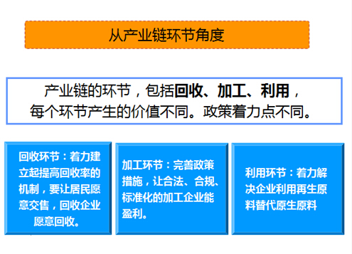 赵怀勇指出,要从再生利用品种、再生资源价值属性转变、产业链环节、处理责任等不同角度全面认识资源再生利用产业的属性。