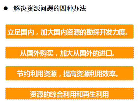 赵怀勇提出了解决资源问题的四种办法:一是立足国内,加大国内资源的勘探开发力度;二是从国外购买,加大从国外的进口;三是节约利用资源,提高资源利用效率;四是资源的综合利用和再生利用。