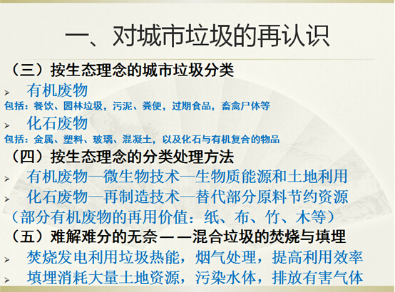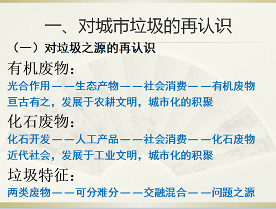 张悦指出,新型城镇化建设背景下的垃圾资源化是要以人为本,梳理好人与自然的关系,突出生态文明建设和生态理念,同时还提出了对垃圾资源化进行再认识与再实践。