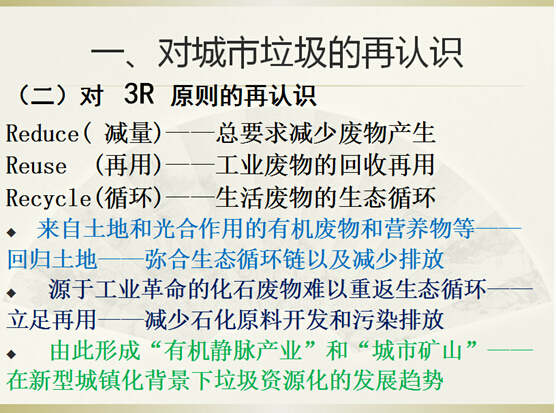 按照生态理念, 垃圾可分为有机废物和化石废物,但目前的现状是两者可分难分,交融混合,是垃圾问题的根源所在。对于这两类的垃圾,首先要遵循减量(reduce)、再生(reuse)、循环(recycle)的原则,在消费、生产过程中要实行节约优先,来自化石的原材料尽量少用。在垃圾资源化处理问题上,对于有机废物应尽量回归土地、弥合生态循环链并减少排放。对于化石废物,应立足于再利用,最后是采用相区分和更有特色的技术路线,实现再循环。其中建立“有机静脉产业”和“城市矿山”是新型城镇化背景下垃圾资源化的发展趋势。