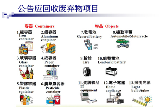 余腾耀执行长首先介绍了台湾地区的废弃物分类和公告应回收废弃物项目。