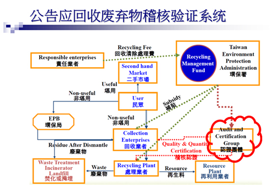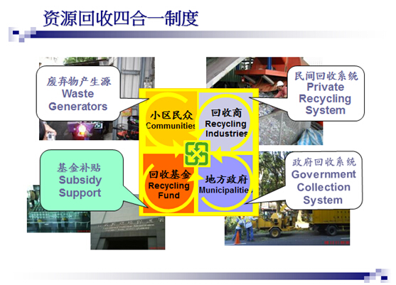 余腾耀执行长还介绍了台湾的废弃物管理架构、一般废弃物分类回收与清理架构、资源回收管理基金制度、资源回收四合一制度。