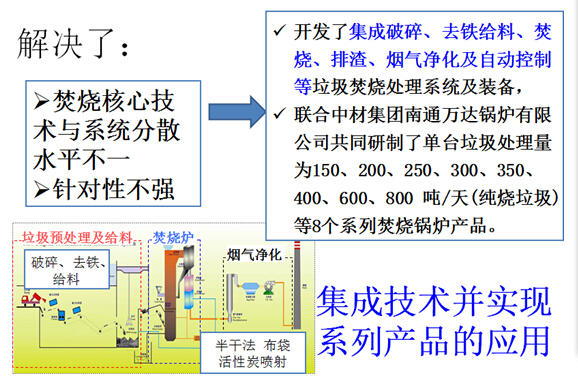 8.开发了集成破碎、去铁给料、焚烧、排渣、烟气净化及自动控制等垃圾焚烧处理系统及装备,联合有关单位共同研制了单台垃圾处理量为150、200、250、300、350、400、600、800 吨/天(纯烧垃圾)等8个系列焚烧锅炉产品。