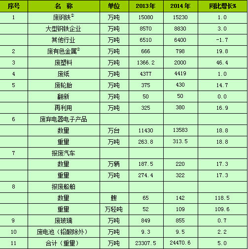 截至2014年底,我国废钢铁、废有色金属、废塑料、废轮胎、废纸、废弃电器电子产品、报废汽车、报废船舶、废玻璃、废电池等十大类别的再生资源回收总量约为2.45亿吨,同比增长5.0%。其中,增幅最大的是报废船舶,同比增长109.6%。